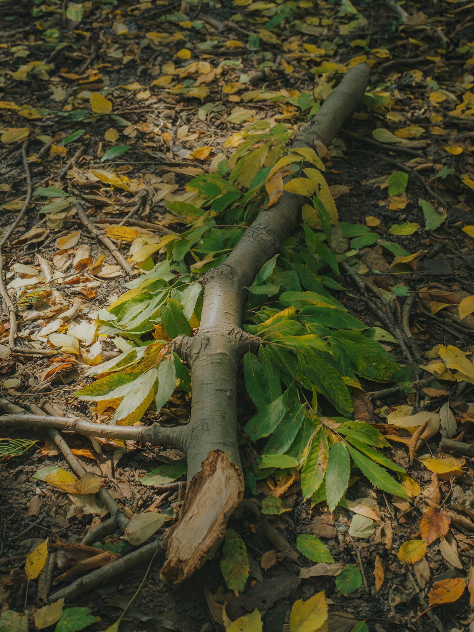 Some branches lay shattered, leaves already wilting; others still clung to the tree, swaying slightly, resilient and alive. Standing there, I felt a wave of tenderness and perhaps unexpectedly, an awareness of my own mortality.